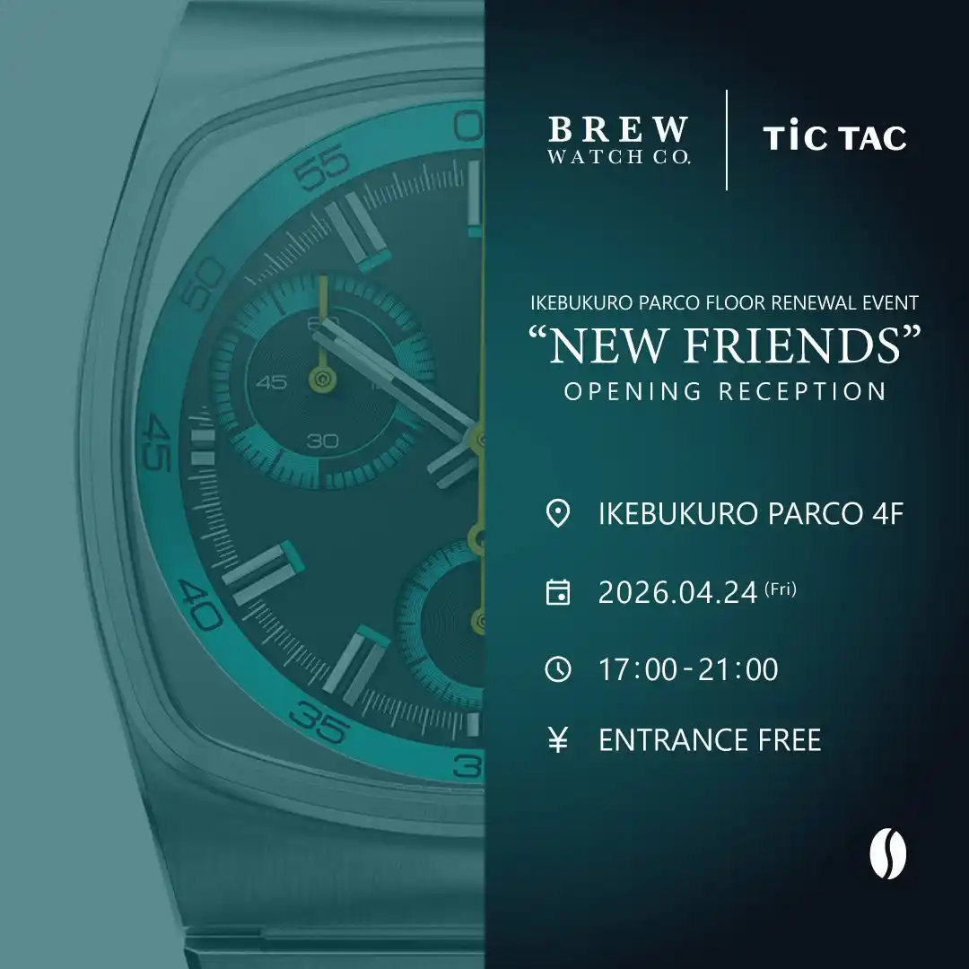 4月24日(金)17時より、昨年7月に改装オープンしたチックタック池袋店のある池袋PARCO 4Fにてリニューアルイベントを開催。チックタックでは「BREW WATCH CO.」の日本未発売モデルを数量限りでご用意。さらに、ブランドコンセプトに因んだコーヒーをご来店いただいた皆様にお配りいたします。 |