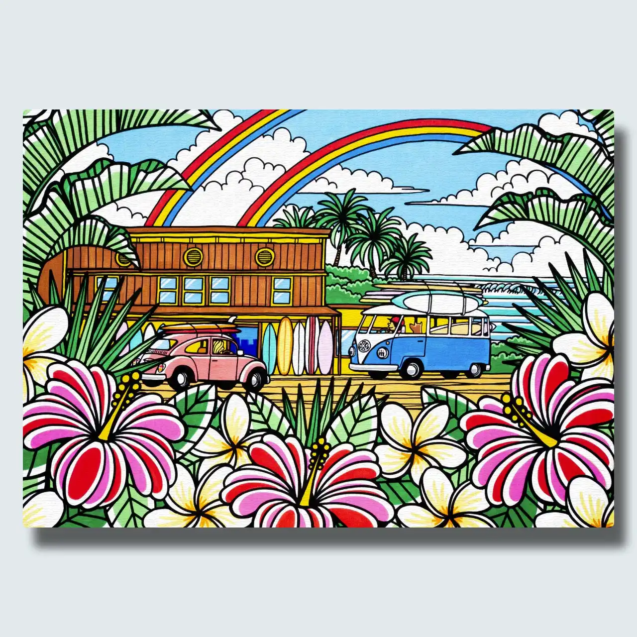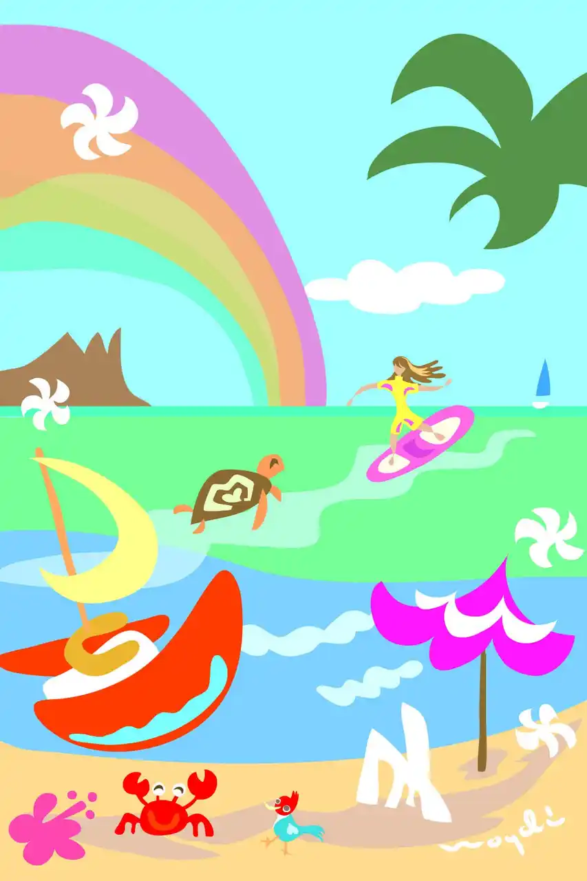 ハワイ在住のノグチが描くワイキキビーチ。ダイヤモンドヘッド、レインボー、ヨット等、楽しいハワイを表現。 |