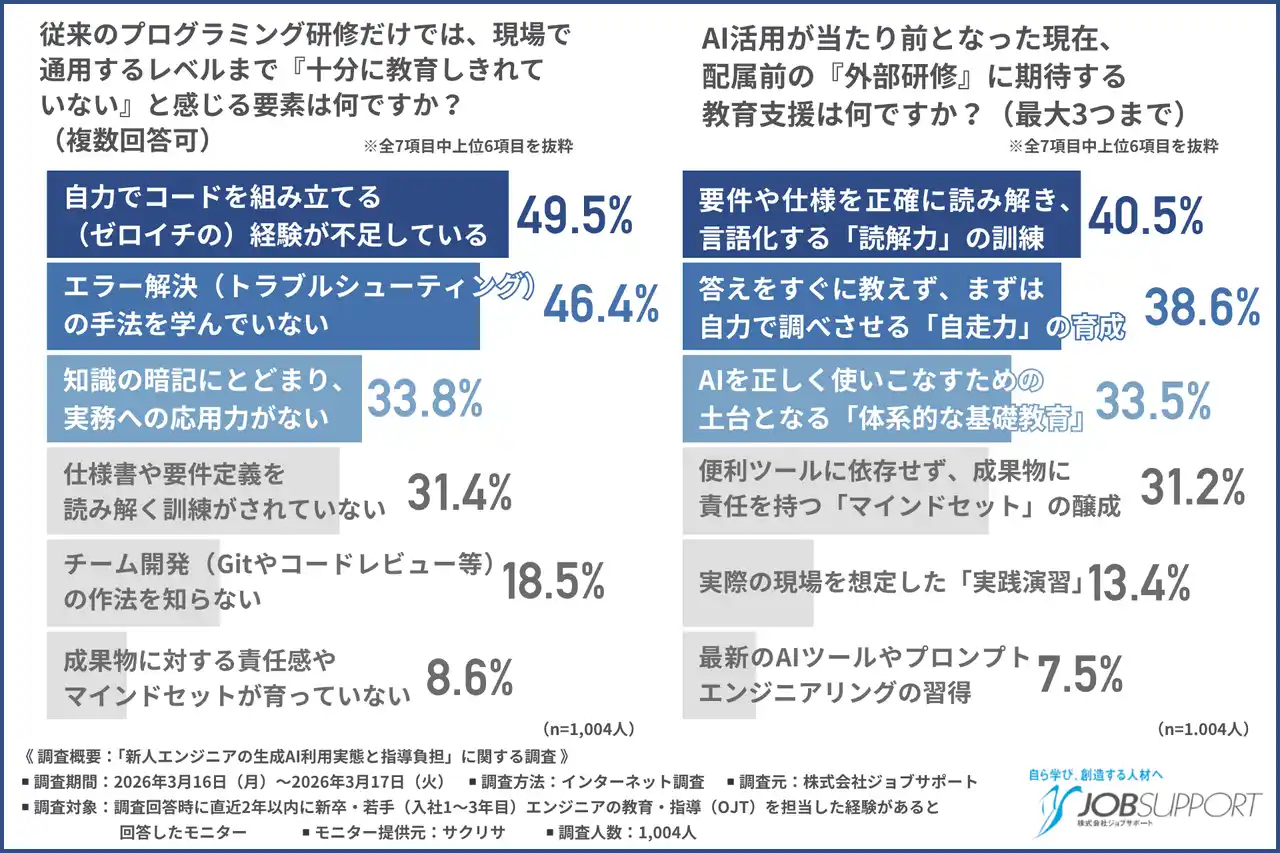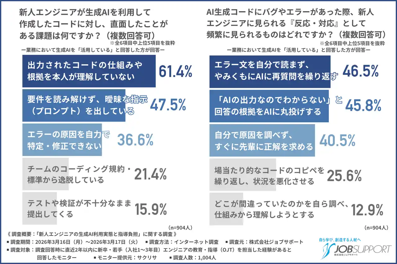株式会社ジョブサポート(所在地:東京都千代田区、代表取締役:塚田 努)は、直近2年以内に新卒・若手(入社1~3年目)エンジニアの教育・指導(OJT)を担当した経験がある方を対象に、「新人エンジニアの生成AI利用実態と指導負担」に関する調査を実施しました。