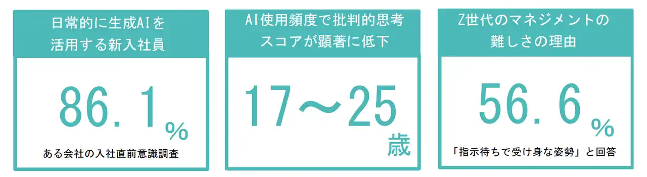 近年、AI技術の進化により「すぐ答えが出る」ことが当たり前の時代になりました。ある企業では2026年度に入社する新入社員の86.1%が日常的に生成AIを使用するという調査結果を発表しています※1。このようにAIに答えを求める習慣が日常化する一方で、「AIの使用頻度が高いほど批判的思考スコアが低下し、特に若年層(17~25歳)でその傾向が顕著である」ことが学術研究で示されており※2、文部科学省も「AIに依存することで批判的思考力が低下するリスク」に言及※3。AI時代は、「自ら問いを立てて考え行動する力」が失われやすい時代であるといえます。 |