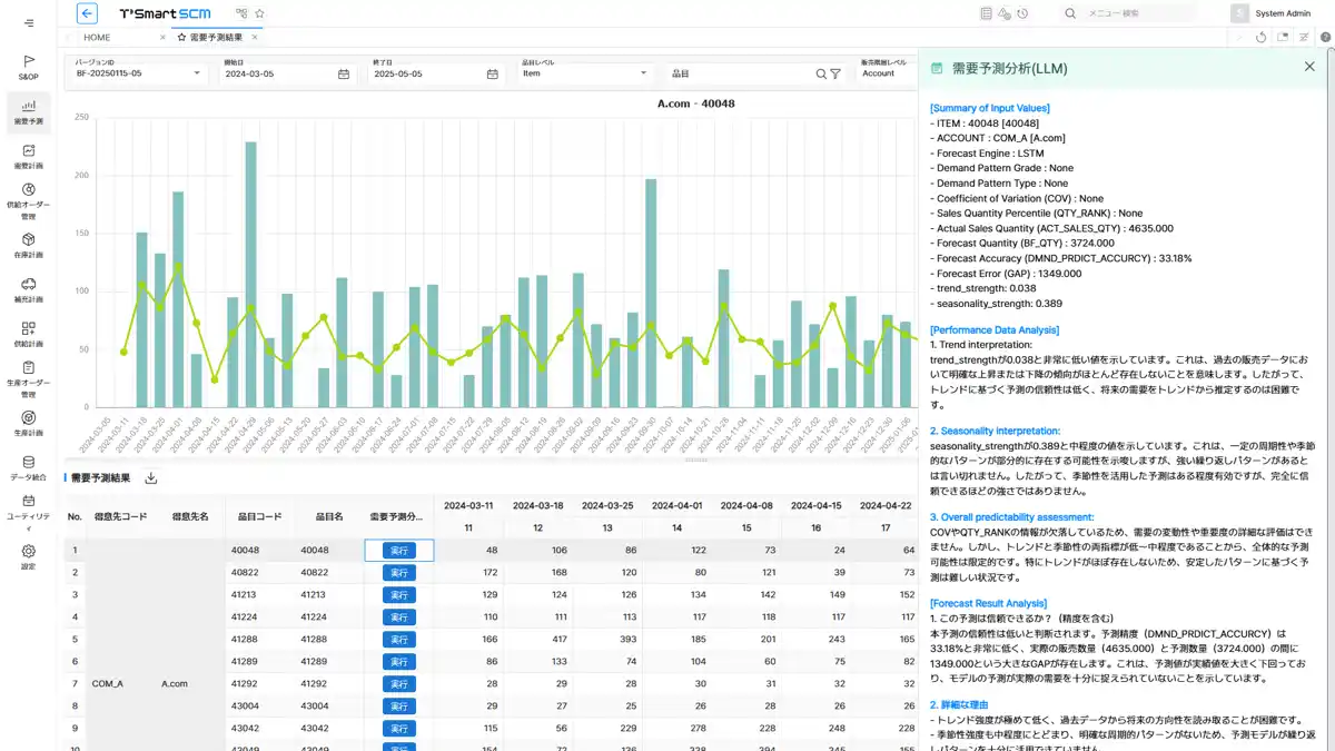 T3Insightの提供を通じて、リードタイム、部材調達、生産遅延といった内部要因に加え、天候や販促施策などの外部要因も踏まえた予測・分析機能の強化を進めて参ります。これにより、サプライチェーン分析基盤をさらに高度化し、将来的にはより自律的なSCMの実現を目指します。 |