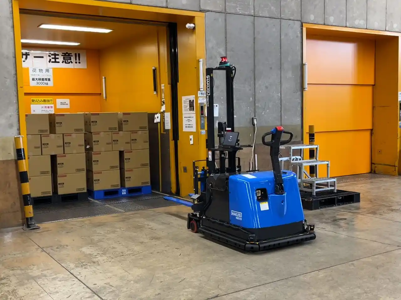 今回の導入では、AutoForkと既存エレベーターを連携させることで、建物の改修を行うことなく自動縦搬送を実現しました。AutoForkが自らエレベーターを呼び出し、荷物を積み込み、目的階へ自動搬送することで、これまで人手に依存していた搬送工程を大幅に効率化しています。また、別フロアから監視カメラ映像を確認しながらタブレット経由で搬送指示を行う遠隔操作も導入し、AutoForkの稼働状況に応じた柔軟なオペレーションを可能としました。さらに、建物の改修を伴わず既存設備を活用した形で導入できる点も評価されました。 |