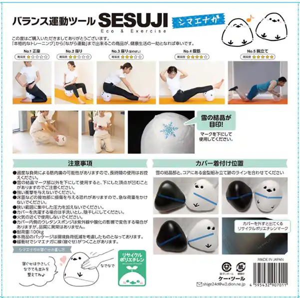 | 「SESUJI」は、体幹トレーニングを日常生活に取り入れることを目的に開発された製品です。芯材には100%リサイクルポリエチレンを使用し、環境配慮と機能性を両立。さらに、シマエナガをモチーフとしたぬいぐるみカバーを採用することで、フィットネス用品でありながらインテリアとしても違和感なく空間に溶け込むデザインに仕上げています。 | ||||||||