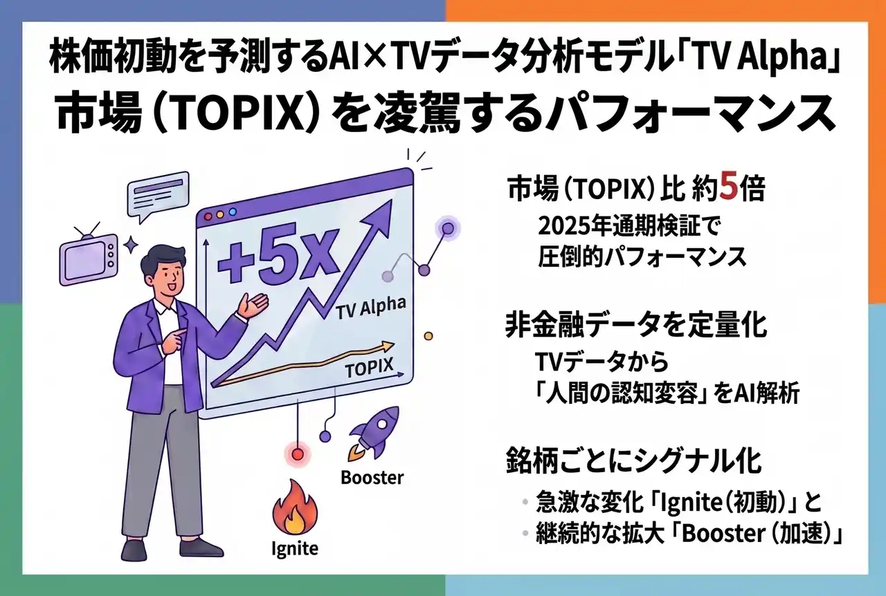 テレビの放送内容をテキスト化した「TVメタデータ」を提供する株式会社エム・データ(東京都港区、代表取締役社長:薄井司)は、AIがテレビ露出データを用いて株価の初動を予測する分析モデル「TV Alpha」を用いた2025年の通期検証において、市場(TOPIX)を約5倍上回るパフォーマンスを確認しました。 |