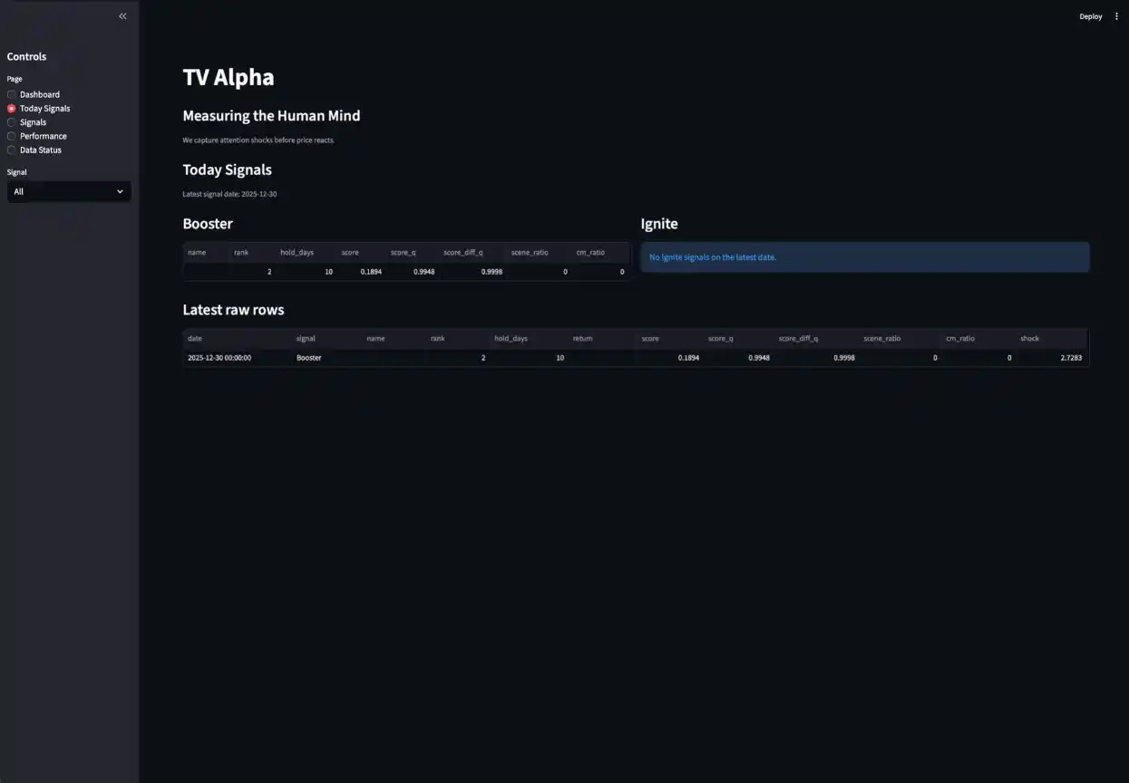 「TV Alpha」は、従来の金融モデリングの延長ではなく、TVメタデータという非金融データ領域において、AIが市場に影響を与える新しい構造を発見する試みとして開発されました。 |
