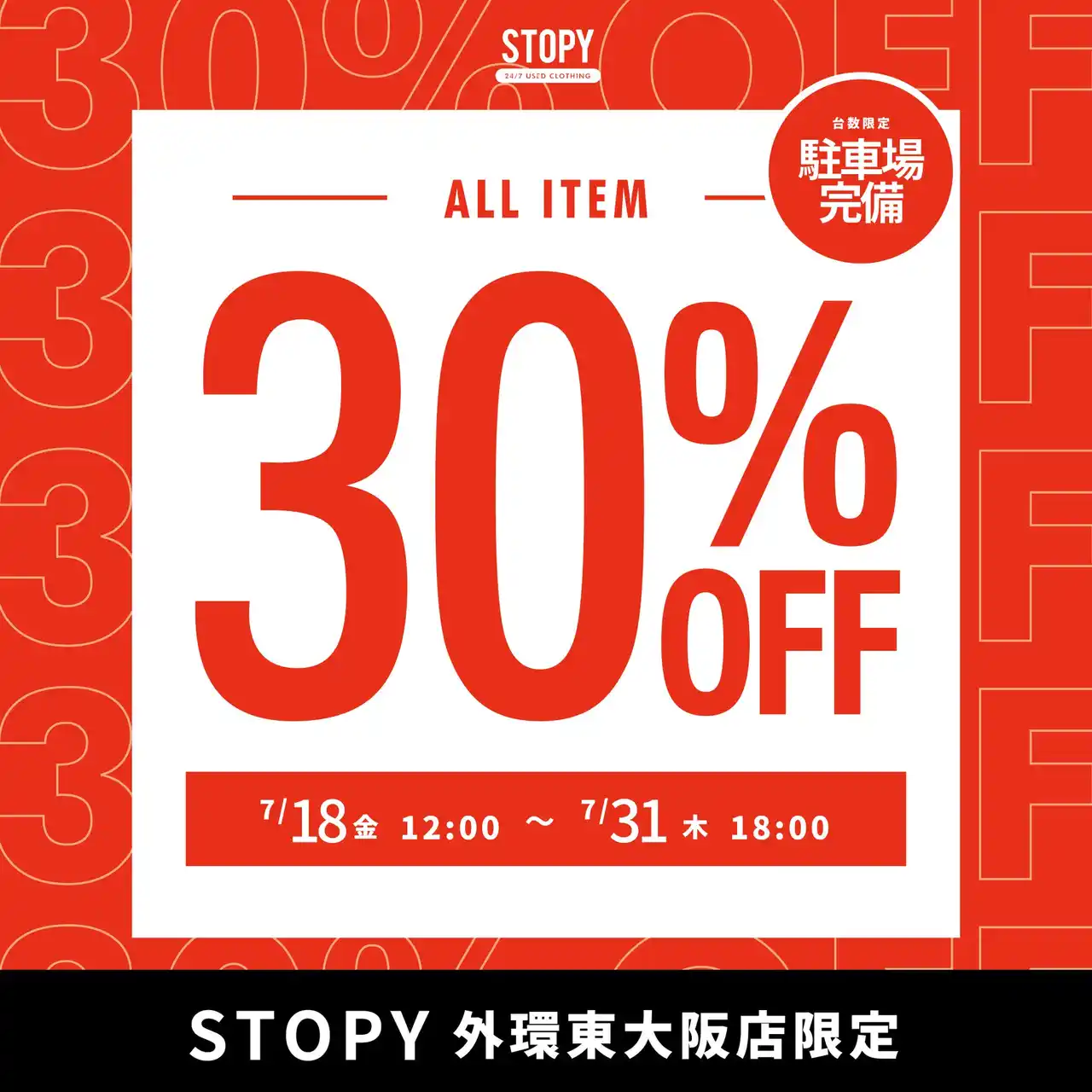STOPYではこれまで、新店オープンイベントとして「3日間5点3,300円」などのキャンペーンを開催しご好評いただいておりましたが、今回は期間を延長し数量制限のない一律30%OFFにすることで今まで以上に、より多くのお客様に魅力的なキャンペーンになると考えております。 |
