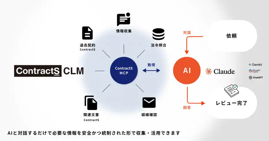 ContractSのアプローチはこれとは異なります。企業がすでに業務で利用しているAI(Claude、ChatGPT、Gemini、Copilot)などから直接「ContractS CLM」の機能を呼び出せるようにすることであり、新しいAIツールの導入や学習なしに、いま使っているAIの延長線上で契約業務を実行できる環境を提供します。 |