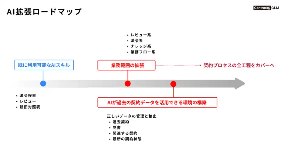 将来的には、契約ライフサイクルの各場面でAIが必要な情報を自動的に提示し、法務担当者は判断と承認に集中できる環境の実現を目指します。 |
