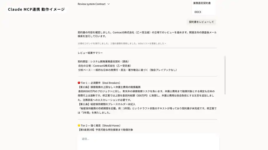 AIに契約書ファイルを渡すと、リスクのある条項を指摘し、修正案を提示してくれます。しかし、その前後の業務――契約書の取得、関連法令の調査、修正版の比較、承認フローへの投入、契約台帳の更新はすべて人の手で行う必要がありました。 |