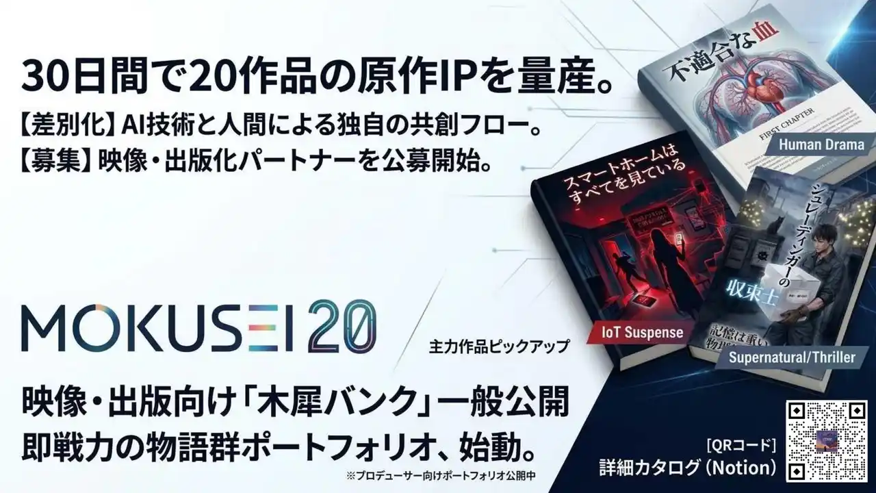 代表・作家の木犀(MOKUSEI)は、生成AI技術と独自のクリエイティビティを高度に融合させ、わずか1ヶ月間で20作品の原作ポートフォリオを完成させました。本日より、これら全作品を「木犀原作バンク」として集約し、映像化・書籍化・コミカライズ等を目指すパートナー企業の公募を開始いたします。 |