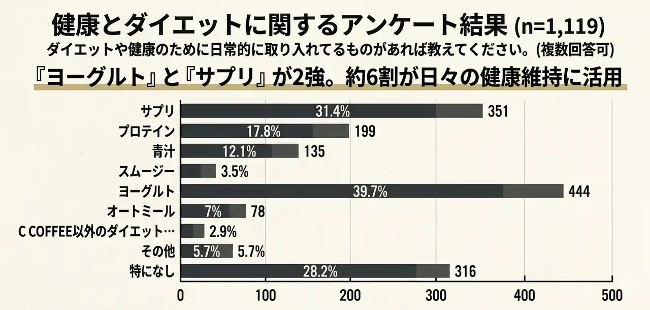 C COFFEE以外で健康やダイエットのために取り入れているものとして、ヨーグルトを上げた会員が約4割(39.7%)に。余分なものを体にため込まず、すっきりさせることを大切に考えていることがわかりました。 |