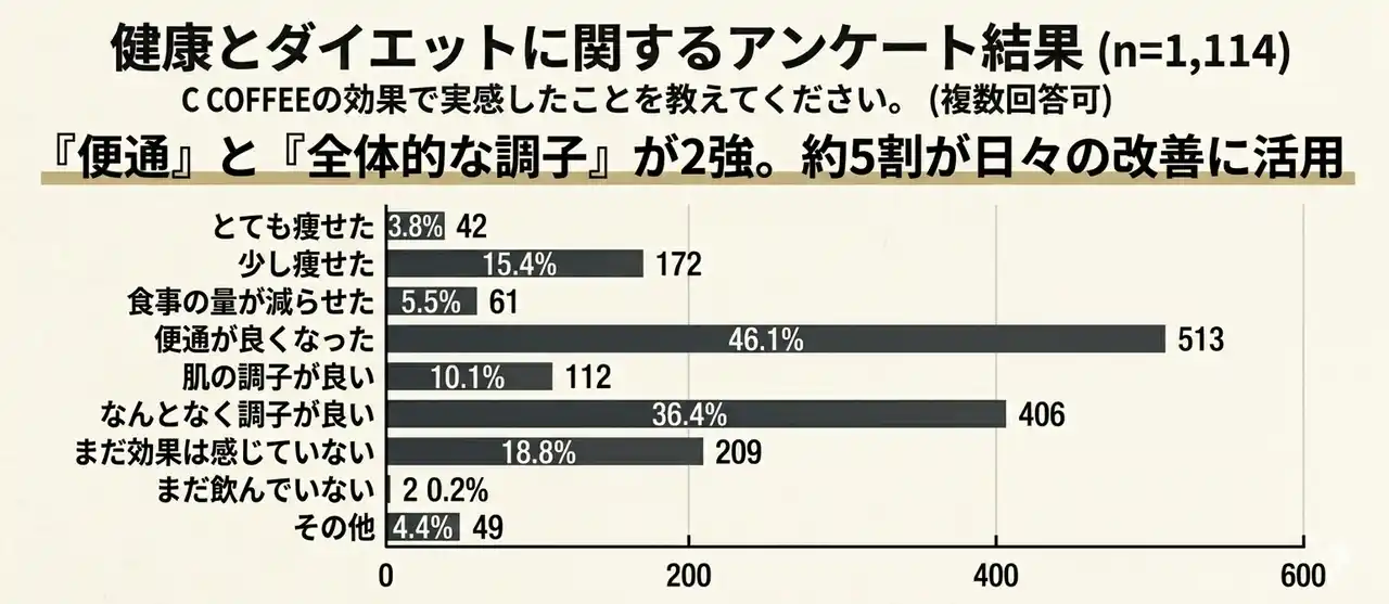 C COFFEEの実感で最も多いのが「便通」で、約半数(46.1%)が「便通がよくなった」と回答しています。また次点で多かったのが「なんとなく調子が良い」という回答(36.4%)。ため込まない、快適な毎日を送れている様子がわかります。 |