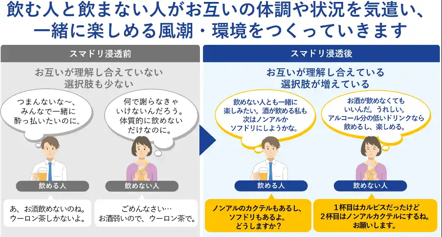 | 今回実施した研修では、適正飲酒や体質理解に加え、ノンアルコール飲料の活用による飲酒量コントロールなどについて解説し、従業員一人ひとりが自身に合った健康的な選択を考える機会を提供しました。こうした取り組みは、従業員の行動変容や健康意識の向上を促す施策として、企業の健康経営においても有効性が期待されます。 | |||