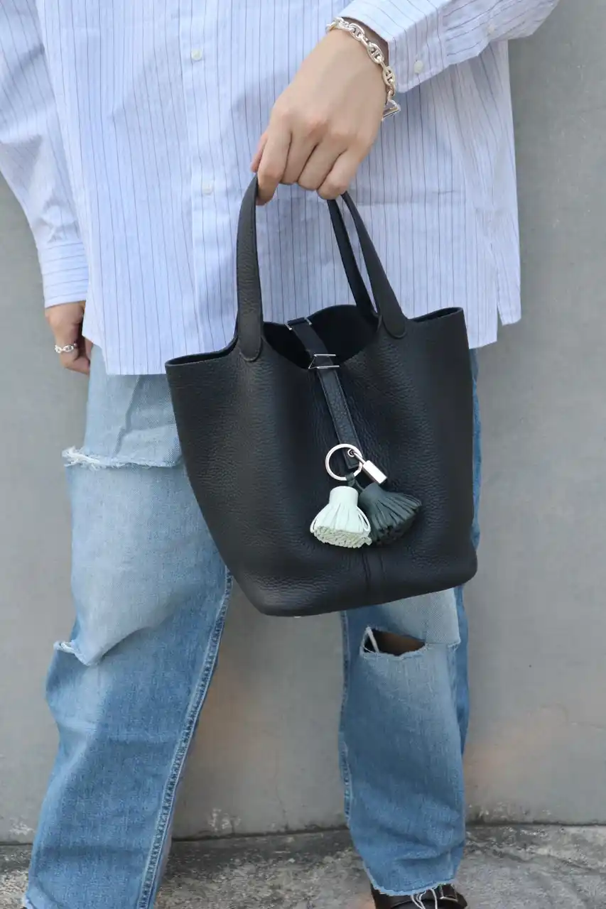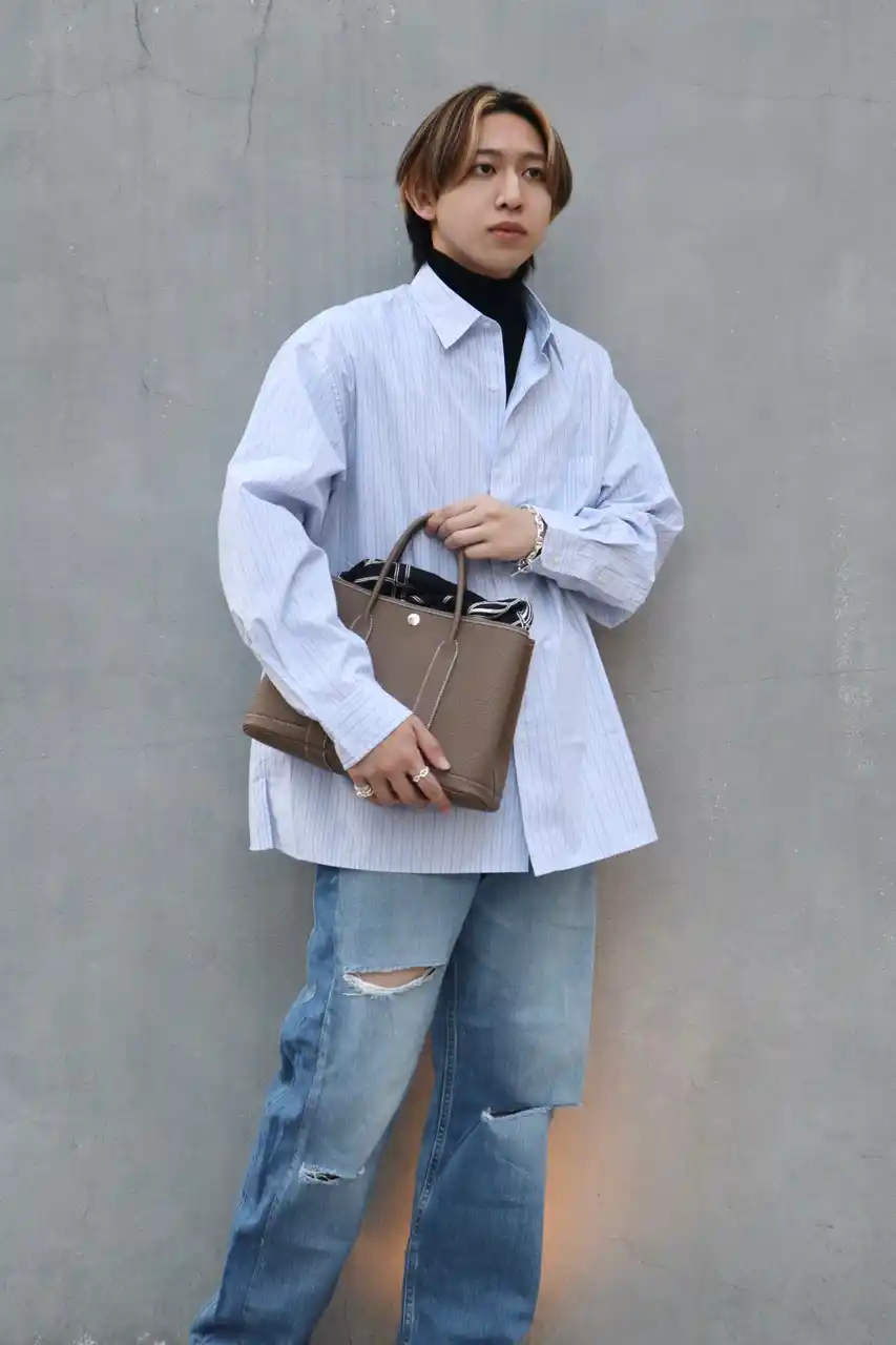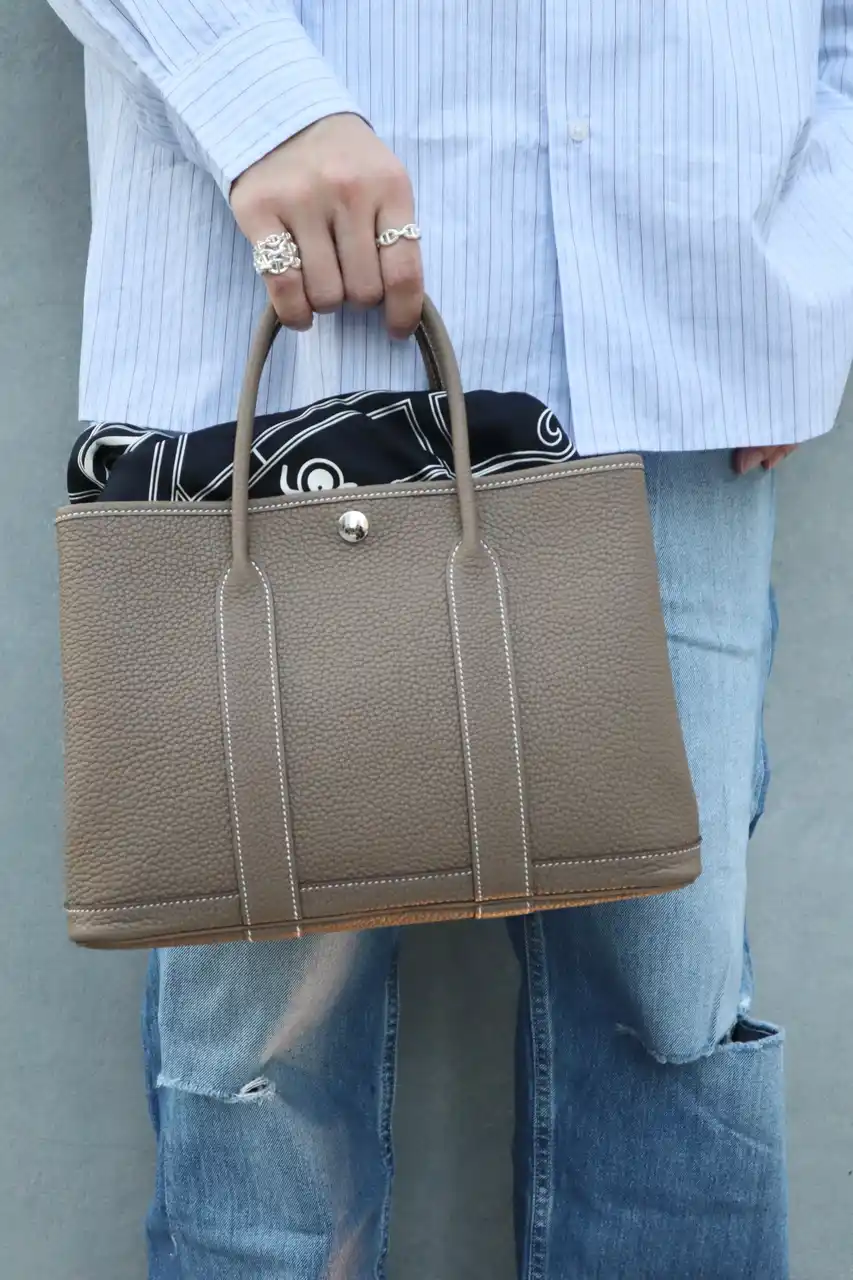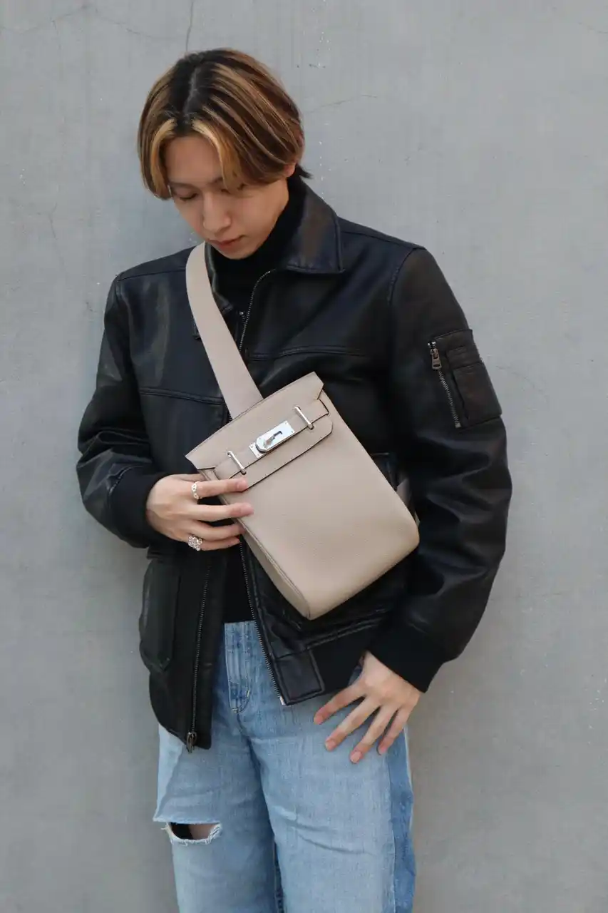 ロゴの主張ではなく、静かな佇まいで上質さを表現する男性が増えています。 グレーやブラックのスーツにシックなバーキンを合わせるスタイルは、“さりげなくて気負わない大人の上質”として支持が拡大しています。 |