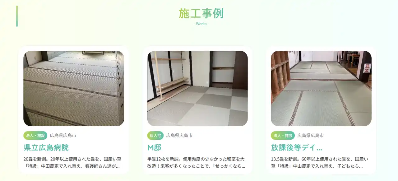 一般家庭を中心に保育施設や学校、指定文化財、寺院などに畳を導入した実績があります。 |