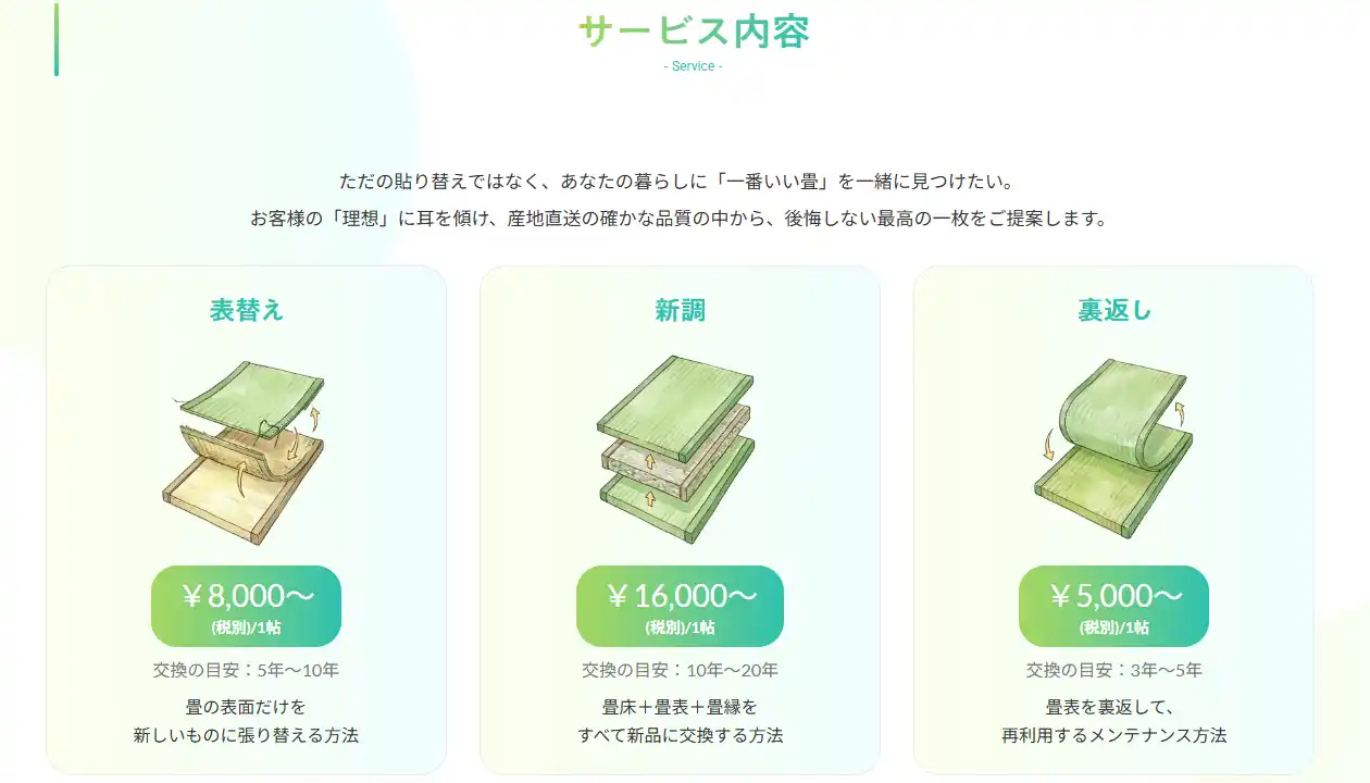 畳の表替え(張り替え)・新調・裏返しなど、サービス内容をよりわかりやすく紹介する構成に刷新