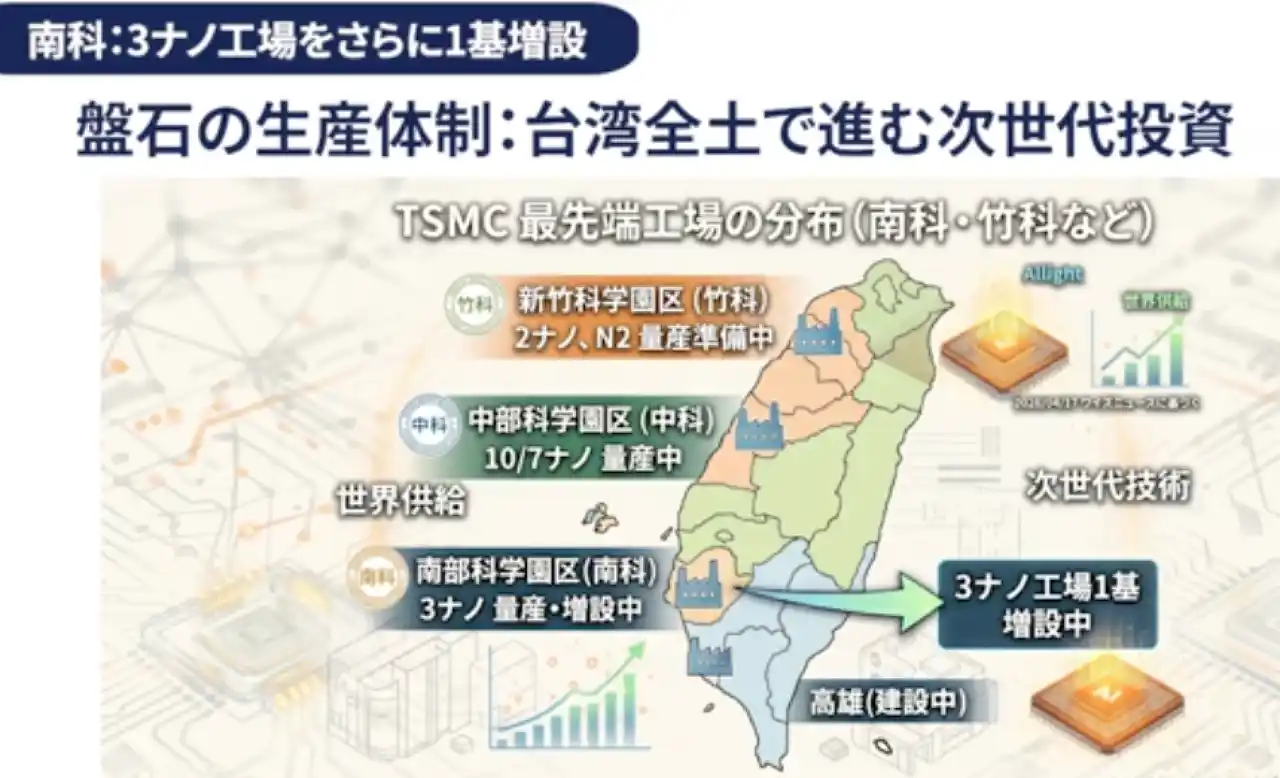 台湾(南部科学園区)での増設に加え、米国アリゾナ州の第2工場(27年下半期量産)、日本の熊本第2工場(28年量産)でも3ナノ製造プロセスを採用し、増産体制を急ピッチで構築しています。 |