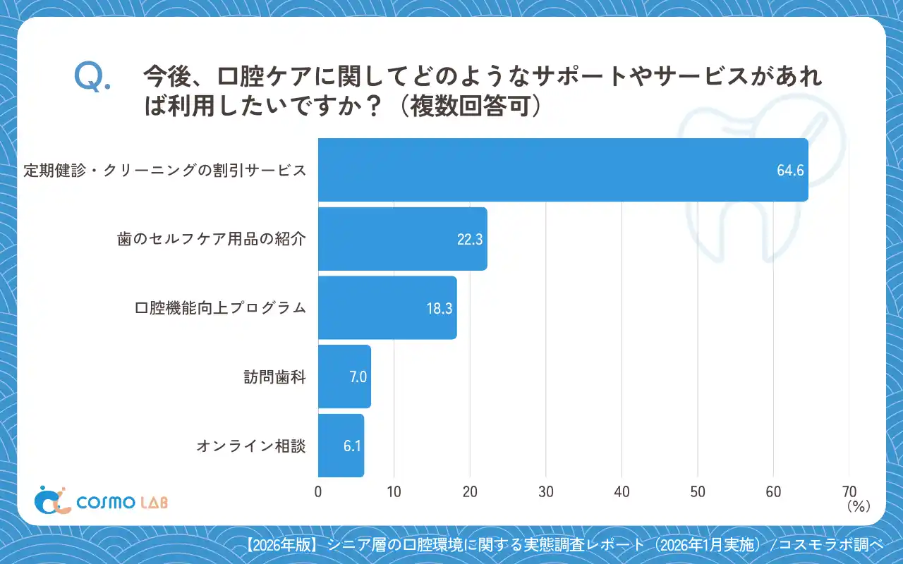 次いで「歯のセルフケア用品の紹介」(22.3%)、「口腔機能向上プログラム」(18.3%)が続き、情報提供と機能改善への関心も確認できます。「訪問歯科」(7.0%)や「オンライン相談」(6.1%)も挙がっており、通院負担を補う選択肢の整備が求められます。 |