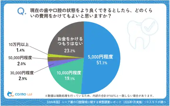 口腔状態をより良くできる場合の許容費用は「5,000円程度」(51.3%)が最多でした。一方で「10,000円程度」(19.1%)も一定割合で、「お金をかけるつもりはない」(23.2%)と回答した人もみられます。 |