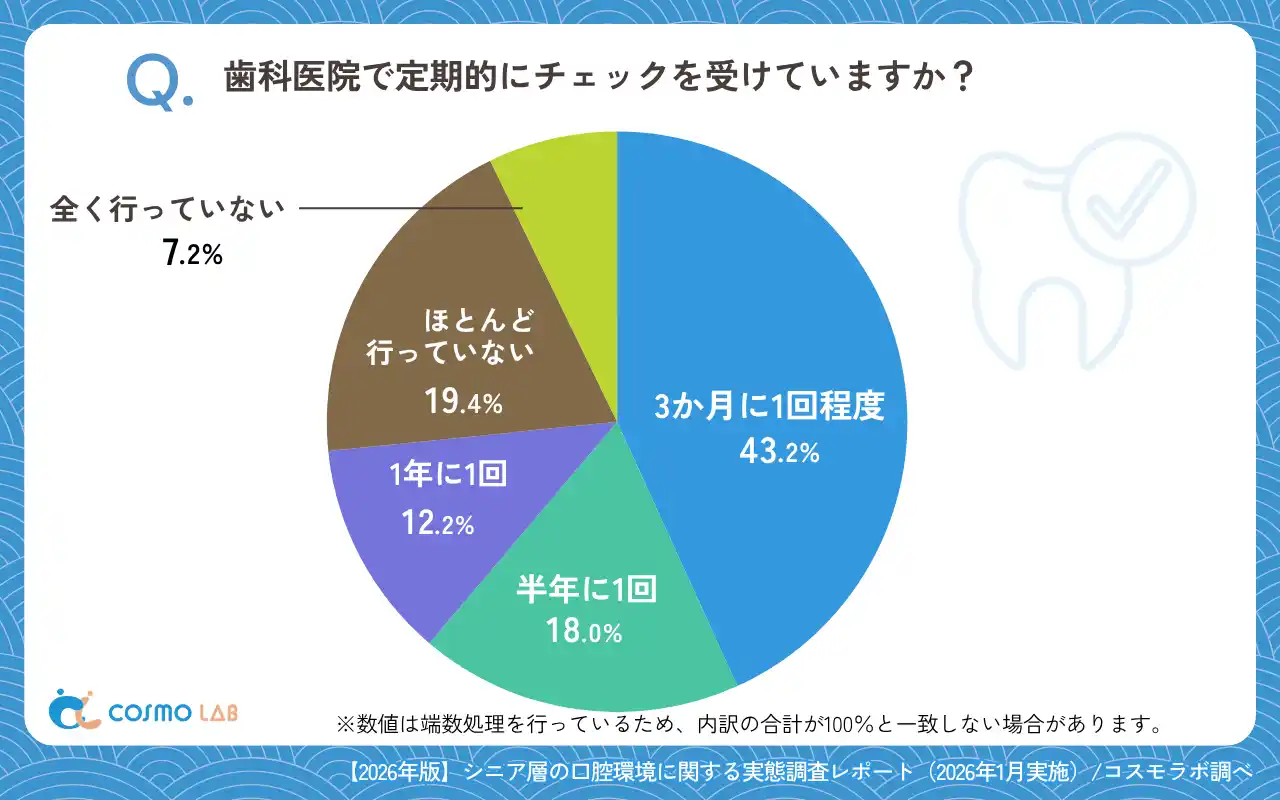 定期的に口腔環境をチェックする人は「3か月に1回程度」(43.2%)が最多で、「半年に1回」(18.0%)、「1年に1回」(12.2%)と続きました。受診する理由は「予防・定期健診」(56.5%)が中心で、予防志向が明らかになりました。 |