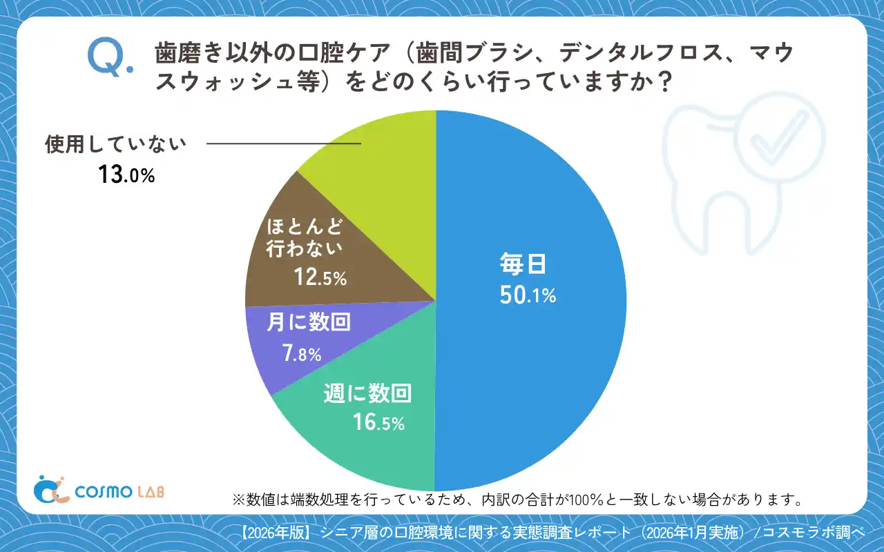 歯磨き以外の口腔ケアは「毎日」(50.1%)が最多となり、補助清掃の実施が広く浸透していることが明らかになりました。 |