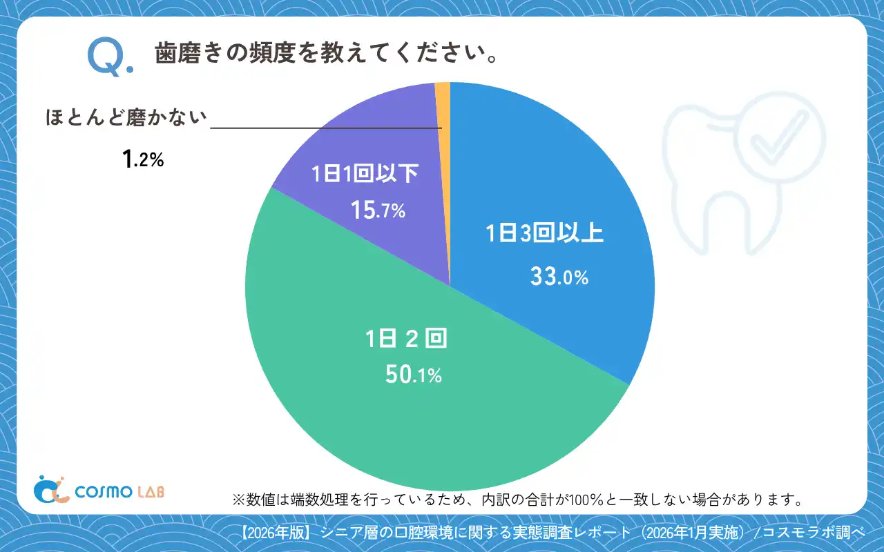 歯磨きの頻度は「1日2回」(50.1%)が最多で、「1日3回以上」(33.0%)も続きました。 |