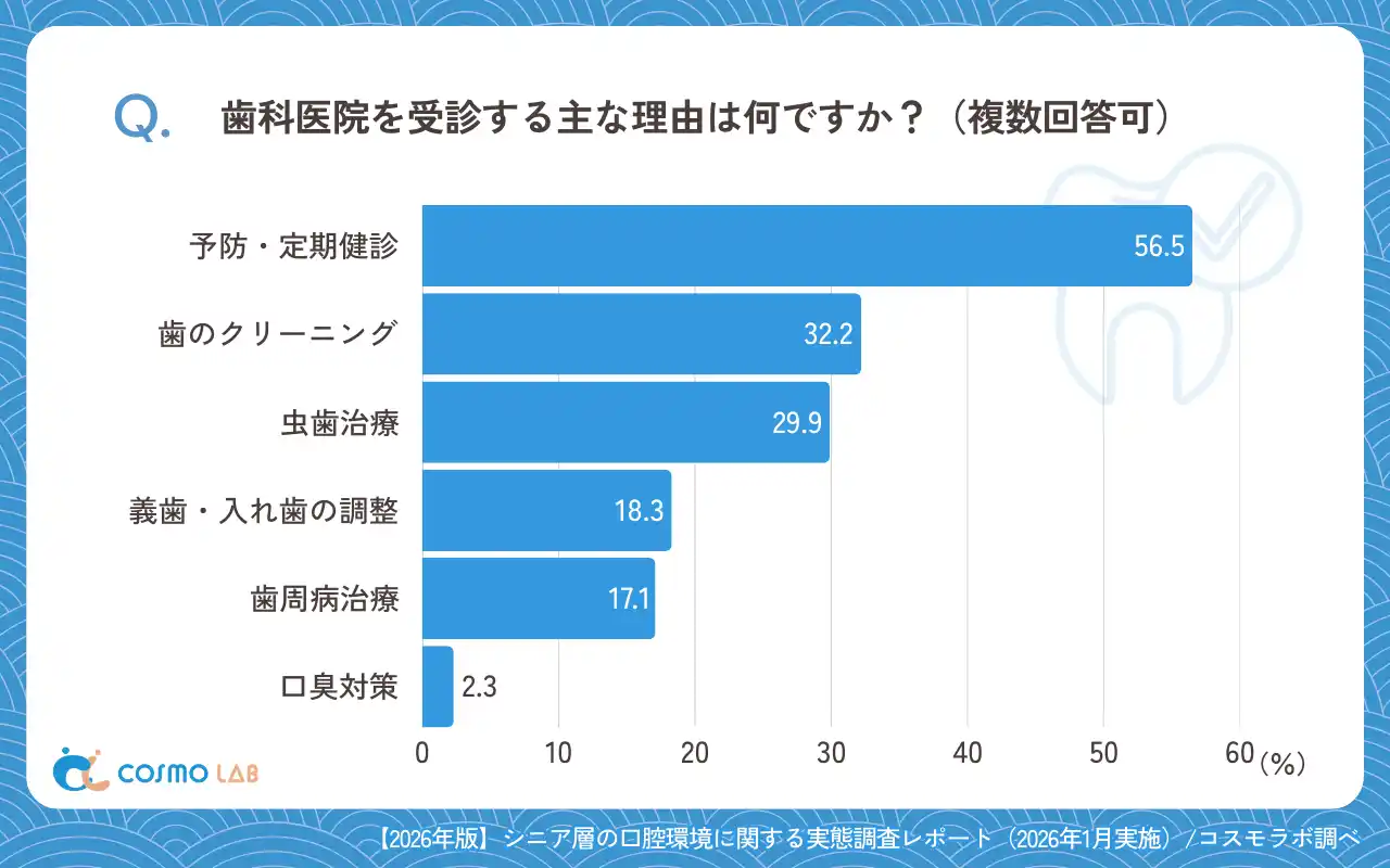 歯科を受診する理由は「予防・定期健診」(56.5%)が最も高く、「歯のクリーニング」(32.2%)が続きました。受診が「治療のため」だけでなく「状態を保つため」にも行われていることが明らかになりました。 |