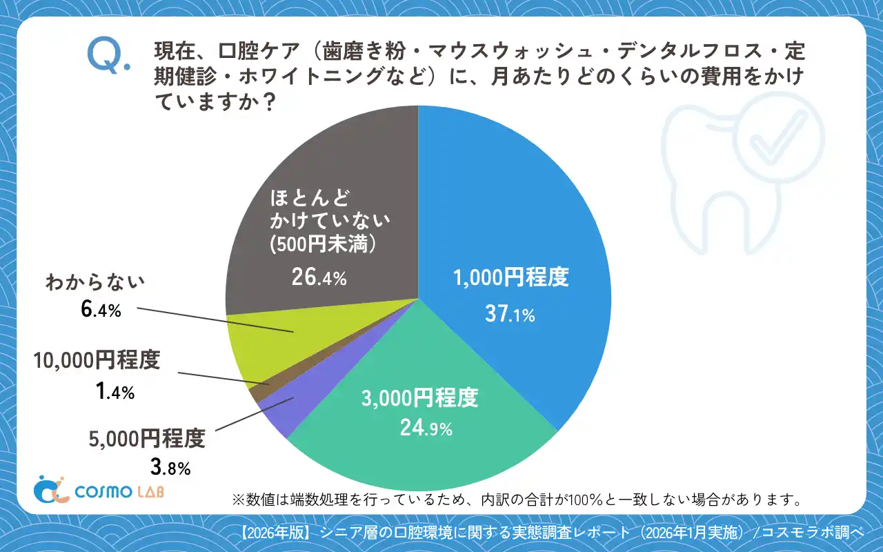 口腔ケアにかける費用は「1,000円程度」(37.1%)が最多で、「ほとんどかけていない(500円未満)」(26.4%)、「3,000円程度」(24.9%)が続きました。 |