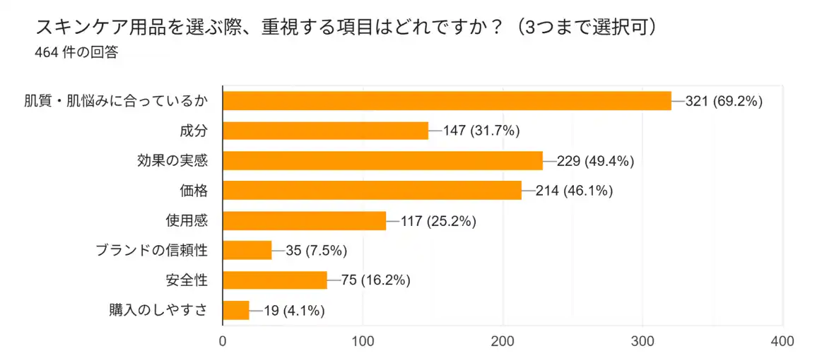 「自分の肌に合うか」「品質への信頼性」「使いやすさ」が多く選ばれており、成分やブランドだけでなく、継続して使いやすい設計であることが重要視されていることが分かりました。 |