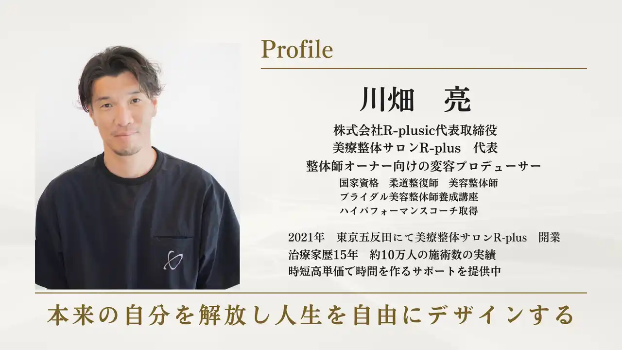 | 川畑 亮は、整体師として延べ10万人以上の施術経験を持ち、身体・思考・感情の変化を統合的にサポートしてきた。現在は整体・コーチング・音楽を融合させた独自のアプローチで、人が本来の力を取り戻すきっかけづくりを行っている。 | |||