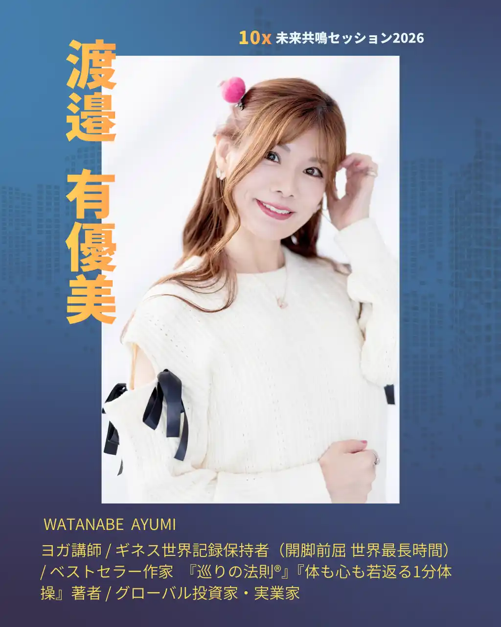 14:30 渡邉有優美 体感セッション(10分) 巡りが整うと、未来は跳ねる 思考を止め、身体から変容を起こす10分。 10xを理解ではなく体感へ落とし込む時間へ |