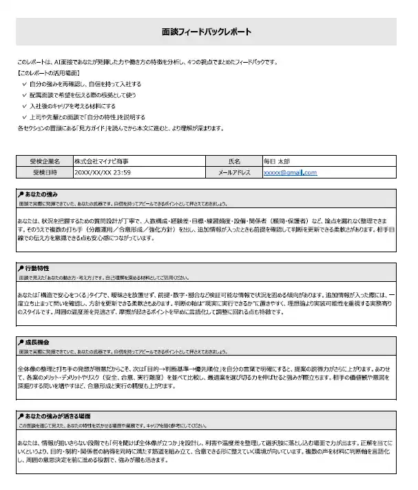 面接結果はレポートとして自動生成され、候補者ごとの強みや特徴、次の選考で確認すべきポイントをすぐに把握できます。また、候補者自身の強みや特徴を知る機会にもつながるよう、候補者向けフィードバックレポートも活用いただけます。採用活動を通じて蓄積されたデータを分析することで、次年度以降の採用プロセスの改善に活用できます。 |
