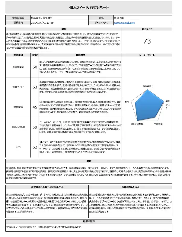 面接で得られた対話内容をもとに、人材基準に沿って候補者の行動特性を分析し、項目ごとのスコアを算出します。分析結果は、人事担当者が候補者一人ひとりをより深く理解するための参考情報として提供されます。 |