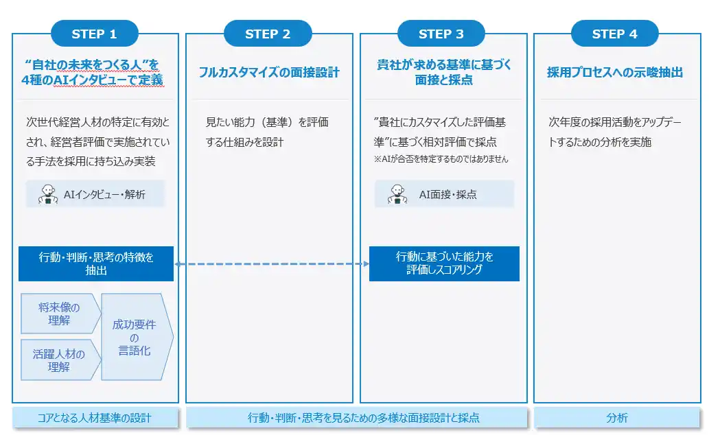 このような背景を踏まえ、AIとの対話を通じて企業固有の「活躍人材像」を整理・可視化し、採用基準の策定から面接の実施・分析まで一貫して提供するサービス『WHAT』を開発しました。 |