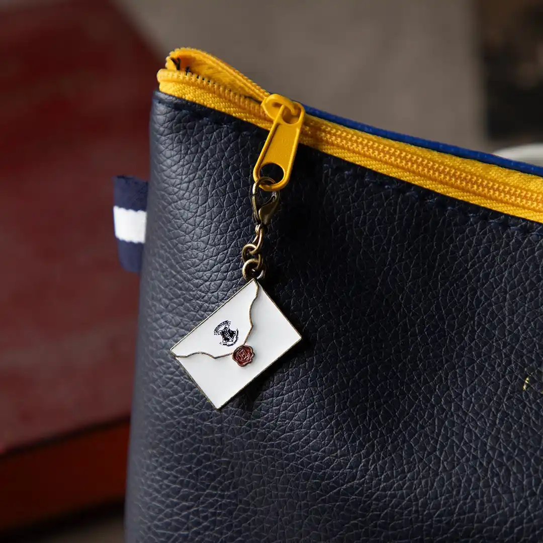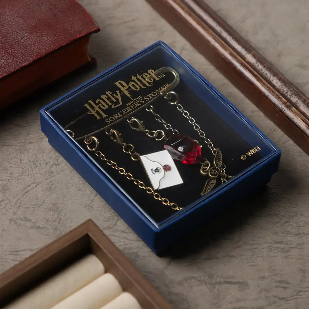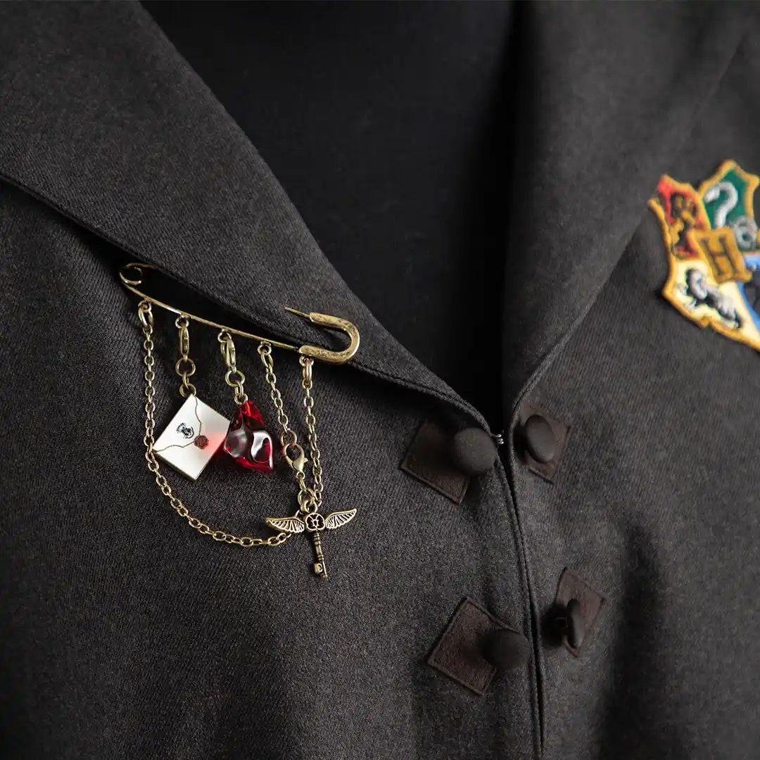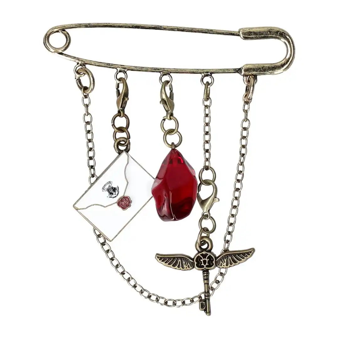 賢者の石とホグワーツ魔法魔術学校の入学許可証、フライングキーのモチーフが連なるブローチです。ジャケットやシャツ、ローブなどの胸元に付けたり、バッグに付けたりするとファッションのアクセントになります。カニカン付きの各チャームは取り外し可能で、ポーチの引き手に付けての使用もおすすめです。 |