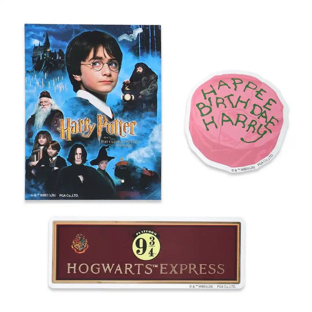 映画『ハリー・ポッターと賢者の石』のメインビジュアルと9と3/4番線の看板、ハグリッドがハリーへ贈ったバースデーケーキのダイカットのステッカー3枚セットです。耐水・耐光仕様で水漏れや色あせの心配をせず、パソコンに貼ったり、スマートフォンの裏に挟んだりできます。 |