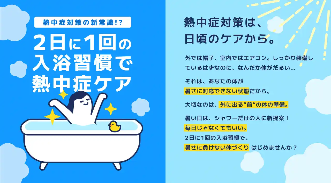 | 当サイトでは、熱中症のしくみや熱中症対策における「入浴習慣」の有用性に着目した研究結果等を公開し、人々の熱中症リスク低減に貢献いたします。また、今後も様々な最新研究結果を順次公開していきます。 | |||