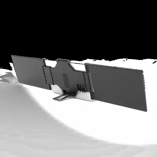 大型の拡張モニターで気になるのが、使用中の「グラつき」です。本体背面には、最大180°まで無段階で調整できるスタンドを搭載。PCのトップ部に引っ掛けて固定する形状に加え、自立スタンドがしっかり支えるため、お好みの角度でディスプレイをピタッと固定できます。 |