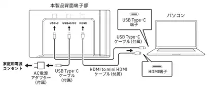 本製品とパソコンを付属のHDMI to mini HDMIケーブルと付属のUSB Type-Cケーブルで図のように接続します。本製品背面接続端子中央のUSB Type-C端子は付属のUSB Type-Cケーブルを使用して付属のAC電源アダプターに接続し、家庭用コンセントに接続します。 |