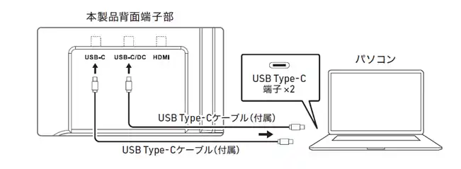 本製品とパソコンを2本のUSB Type-Cケーブルで図のように接続します。 |