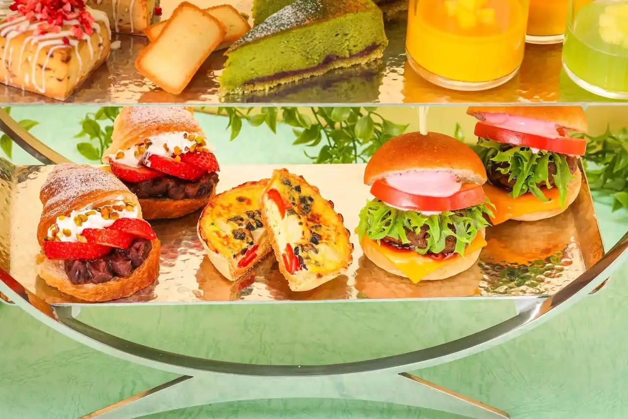 | スイーツを引き立てる下段には、ランチ代わりにもなる大満足のメニューが集結。一口サイズながらお肉の旨味をダイレクトに感じる「和牛スマッシュバーガー」をはじめ、「三角帽のいちごクロワッサンサンド」など、甘みと塩味で最後まで飽きることなくお愉しみいただけます。 | |||||||||||