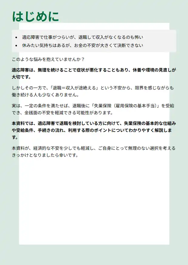 本資料では、適応障害のある人が知っておきたい失業保険の仕組みや活用方法についてわかりやすく解説しています。 |