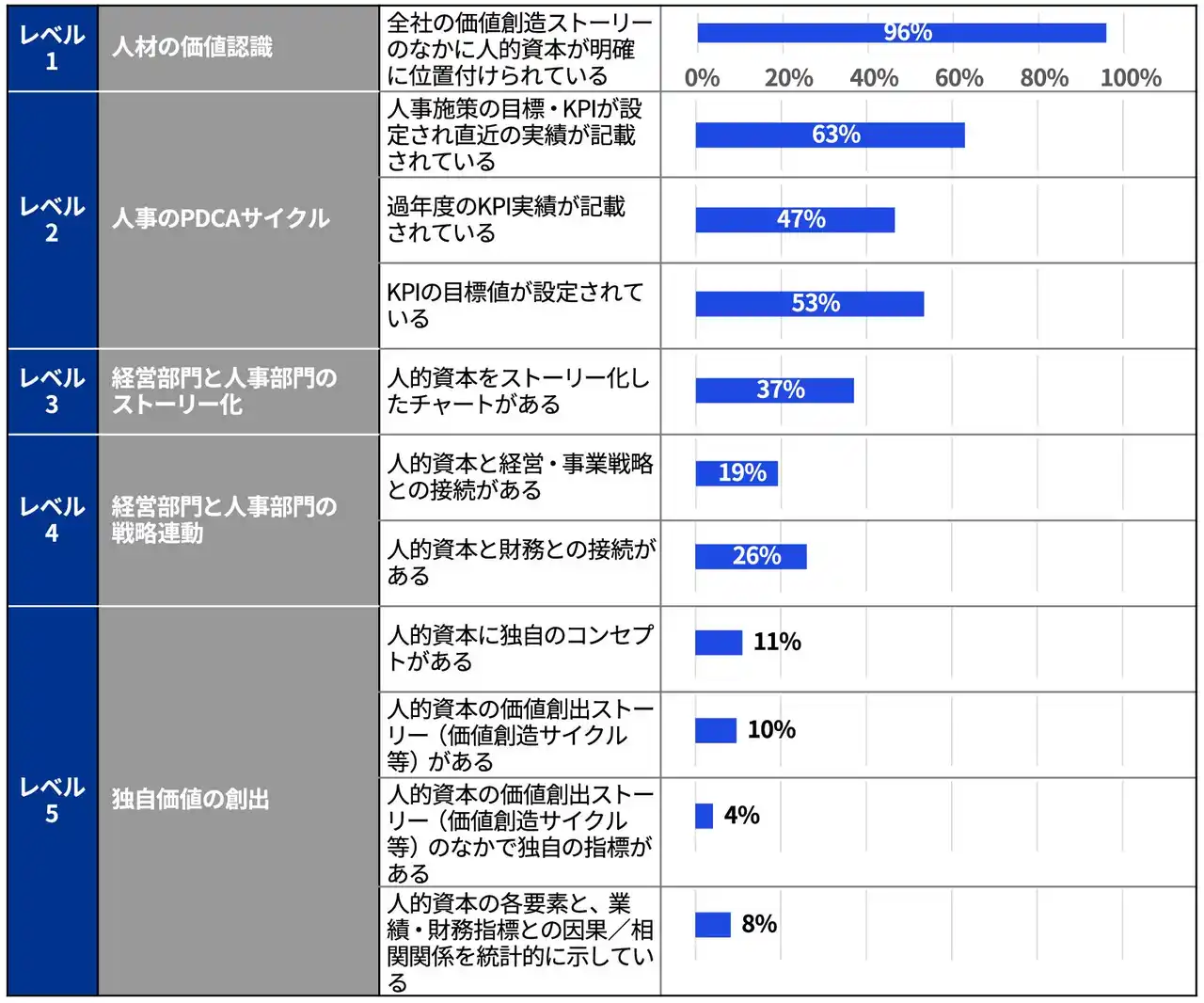 2.調査結果詳細 調査1.人的資本ストーリーの成熟度 成熟度を5段階(レベル1:人材の価値認識、レベル2:人事部門のPDCAサイクル、レベル3:経営部門と人事部門のストーリー化、レベル4:経営部門と人事部門の戦略連動、レベル5:独自価値の創出)に分けて、人的資本ストーリーの成熟度の分析を行いました。 |