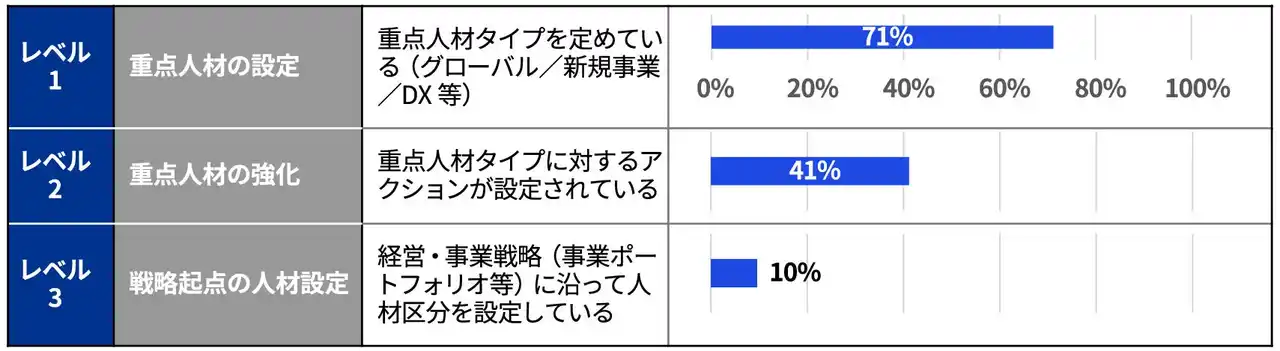 人材ポートフォリオについては、約7割の企業が経営人材、グローバル人材、デジタル人材など、何らかの重点人材のタイプを設定していることが確認されました。一方で、経営・事業戦略に基づいて人材のタイプを設計していると把握できる企業は10%に留まりました。多くの企業において、人材ポートフォリオが中長期の戦略と十分に連動した形で整理されていない可能性が示唆される結果となっています。 |