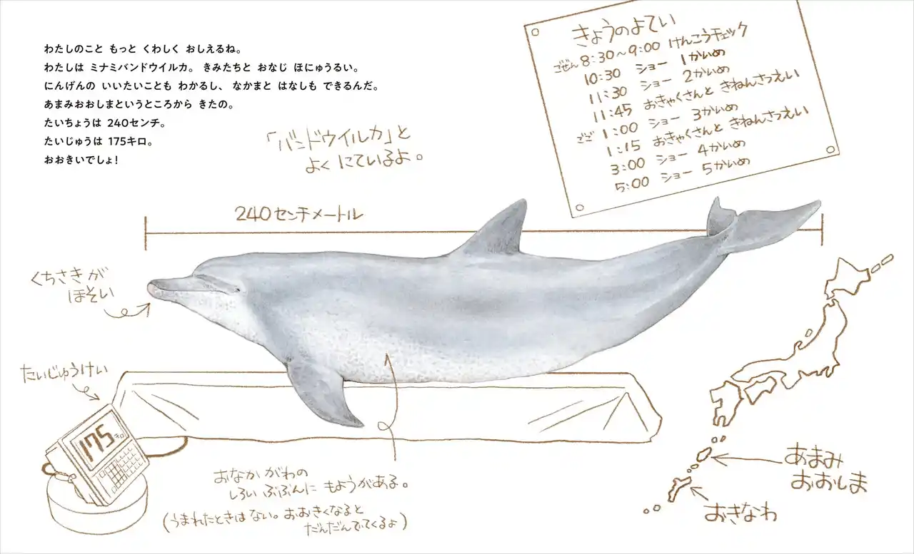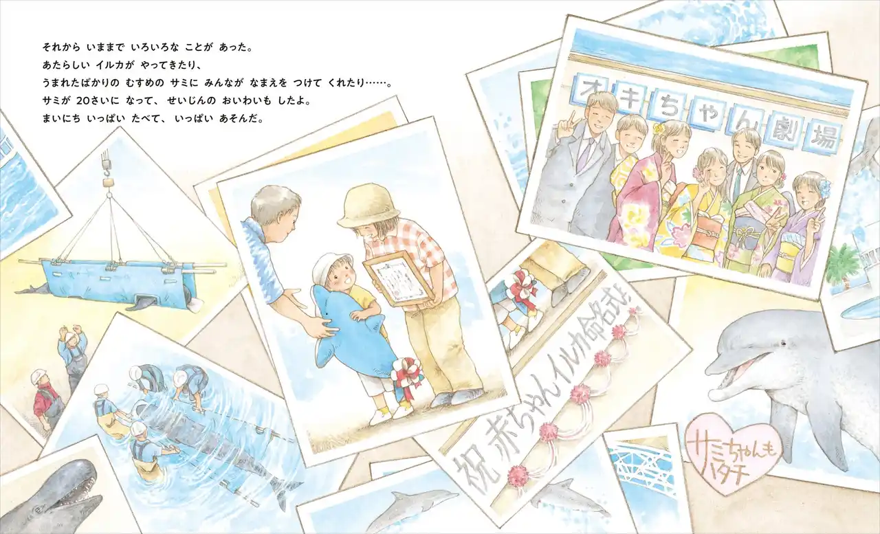 オキちゃんの好物や得意技にはじまり、仲間のイルカたちとのエピソード、愛娘サミへのあたたかな眼差し、水族館スタッフ、そして観客たちとの関わりを描いています。 |