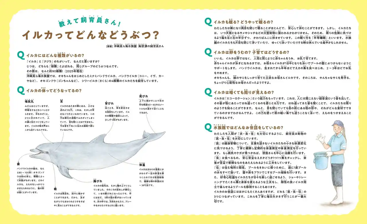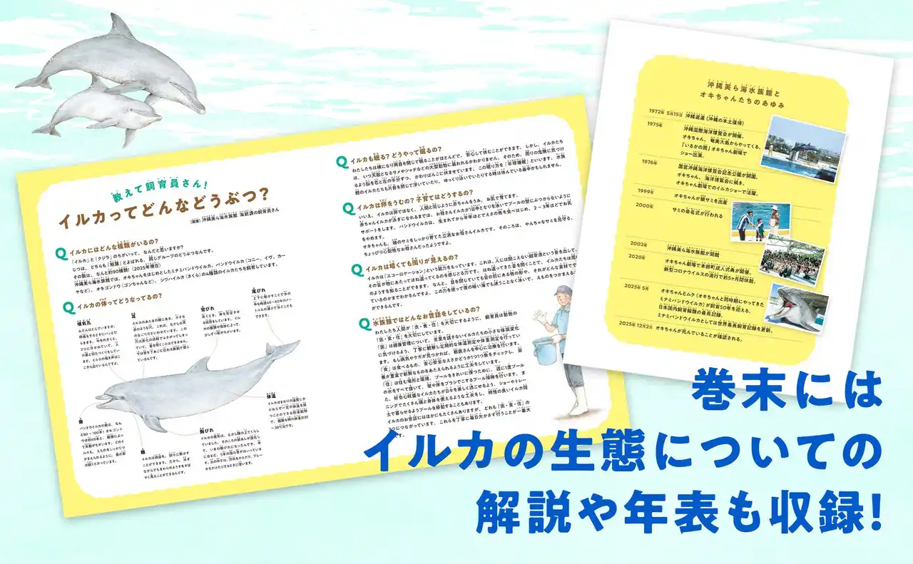 本書の巻末には、イルカの生態についての解説ページ「教えて飼育員さん! イルカってどんなどうぶつ?」や、沖縄美ら海水族館とオキちゃんたちのあゆみをたどる年表、関係者によるメッセージ等も収録しています。 |