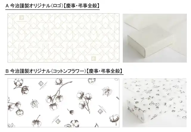 A 「今治謹製オリジナル(ロゴ)【慶事・弔事全般】」 B 「今治謹製オリジナル(コットンフラワー)【慶事用・弔事全般】」がよく選ばれています。 |