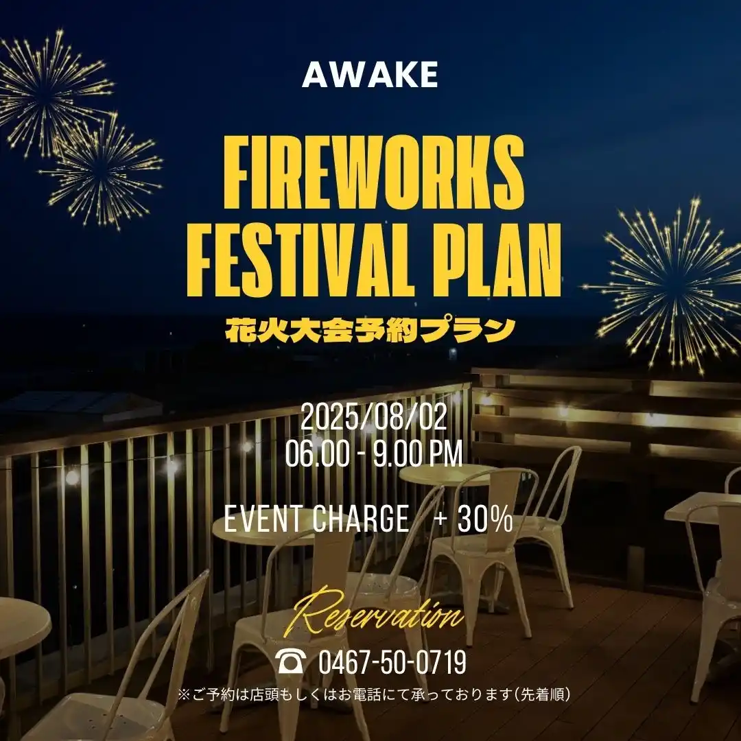また、夏に開催される花火大会の際には、テラス席からサザンビーチに打ち上がる花火を間近で眺めながら、食事とともに感動のひとときを過ごすことができます。この立地ならではの贅沢な体験も、AWAKEの大きな魅力の一つとなっております。 |