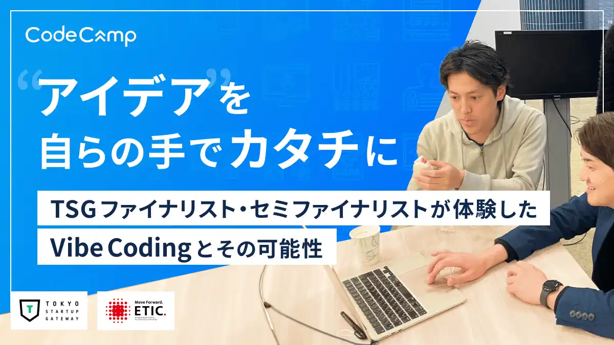 コードキャンプ株式会社(本社:東京都品川区、以下 CodeCamp)は、東京都主催、NPO法人ETIC.が運営事務局を担うスタートアップビジネスコンテスト「TOKYO STARTUP GATEWAY(以下、TSG)」のセミファイナリスト・ファイナリスト向けに、生成AIを活用したWeb開発手法「Vibe Coding」を学ぶ「アイデアを形にする 実践Vibe Coding集中講座」を2026年3月、オンラインと対面の2日間にわたり開催しました。 |