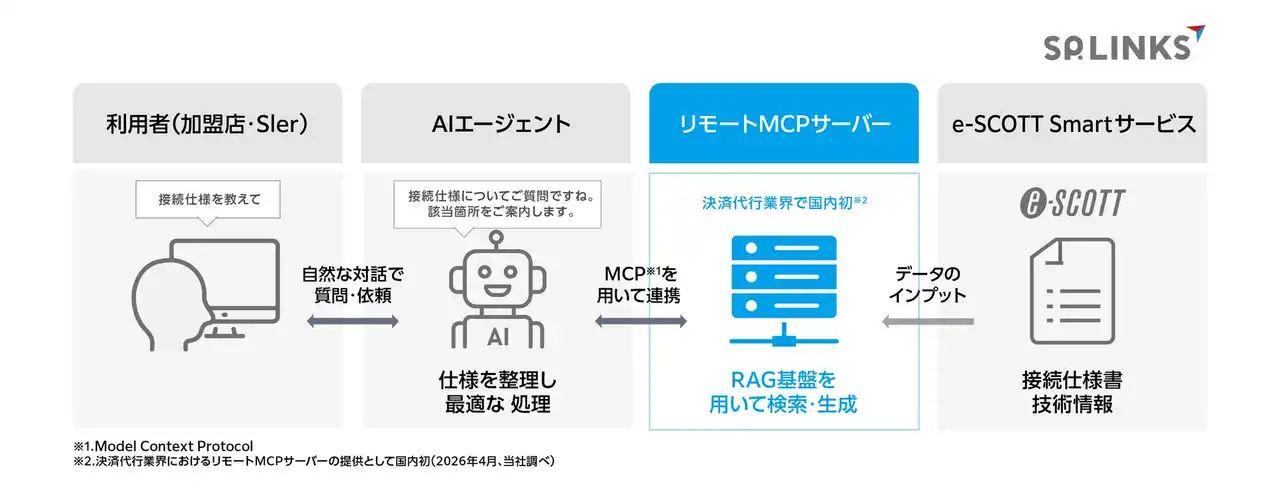 SP.LINKS株式会社(本社:東京都港区、代表取締役社長:野村亮輔 )は、決済代行サービス「e‑SCOTT Smart(イースコット・スマート)」において、AIと業務システムを安全かつ柔軟に連携させる共通仕様「MCP(モデル・コンテキスト・プロトコル、Model Context Protocol)」に対応したリモートMCPサーバーを提供開始します。本機能により、加盟店のシステム担当者や同店をサポートするSIerは、「e-SCOTT Smart」の導入・設定・運用に関する問い合わせや確認を、サービス仕様を理解したAIと自然な対話で行うことが可能となります。SP.LINKSは本取り組みを通じて、「e‑SCOTT Smart」をAI時代にふさわしい、より分かりやすく、直感的に利用できる決済サービスへと進化させていきます。 |
